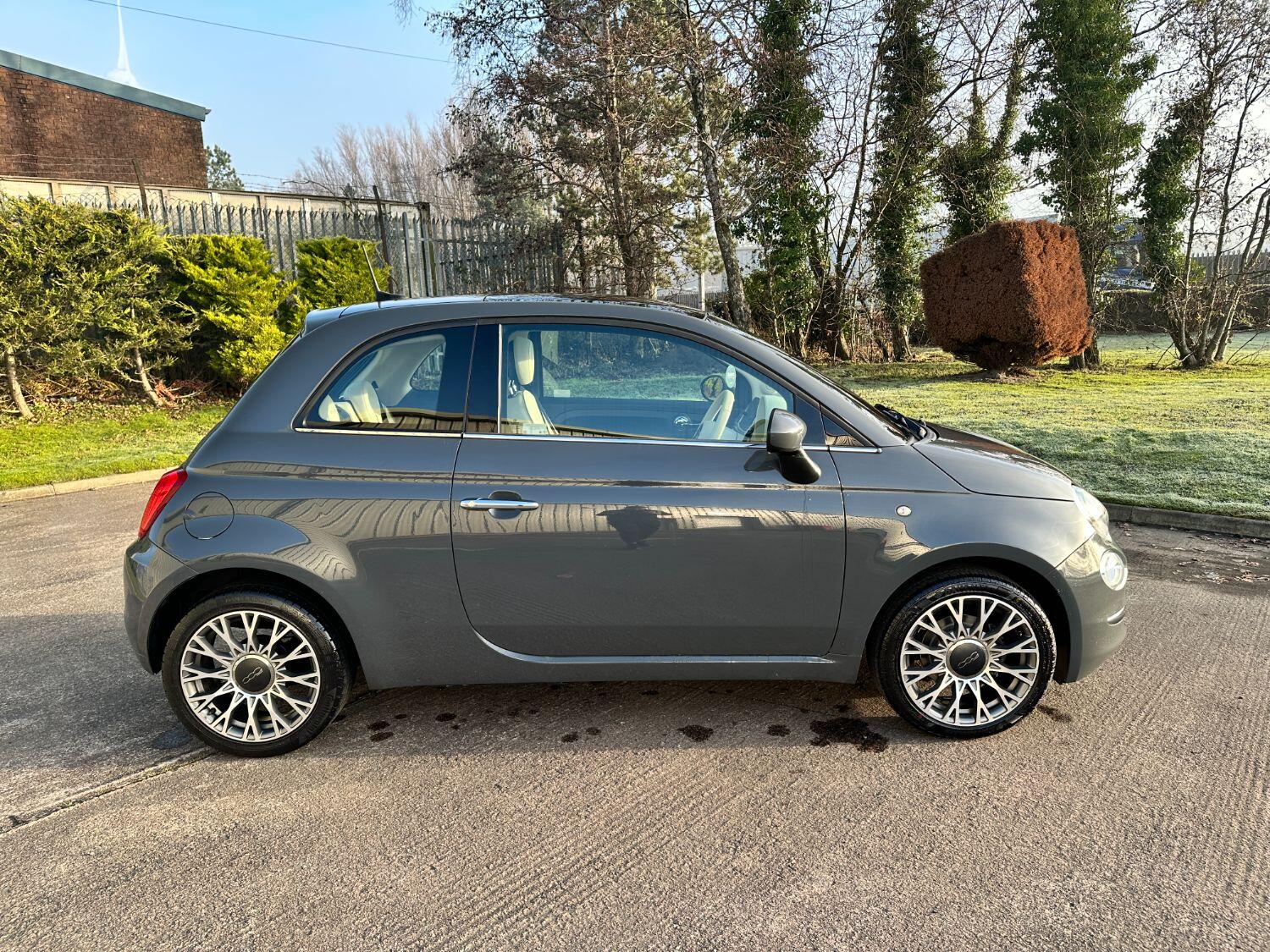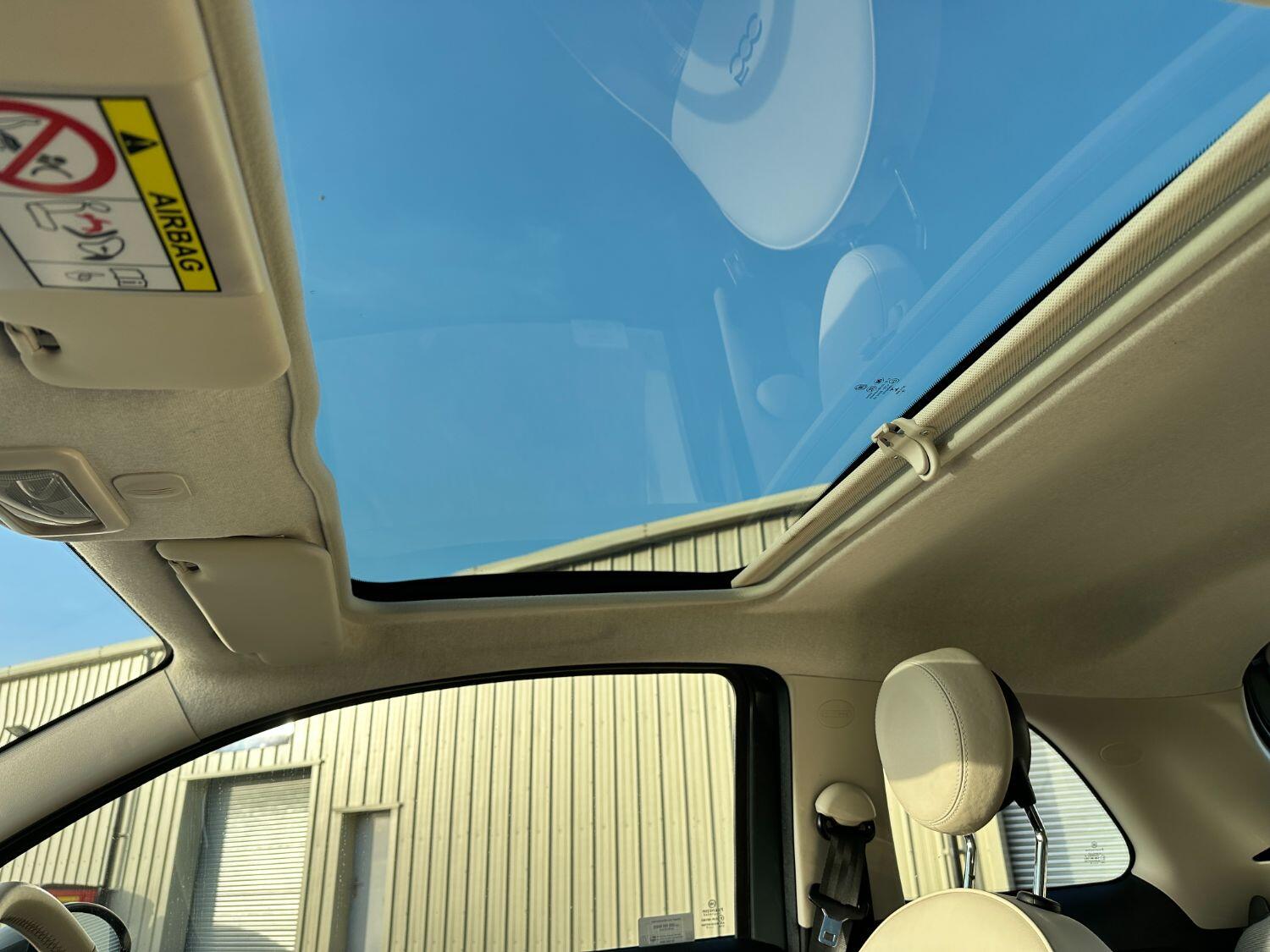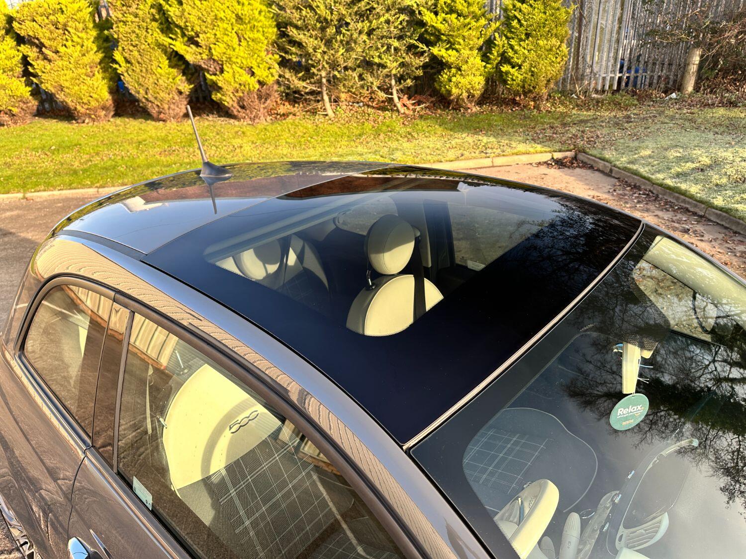 The Fiat 500 Lounge is known for its unique features, and this model is no exception. Finished in a sophisticated grey exterior paired with a light interior, it offers a chic and modern aesthetic. One of the standout features is the glass roof, allowing natural light to flood the cabin and providing an airy feel.